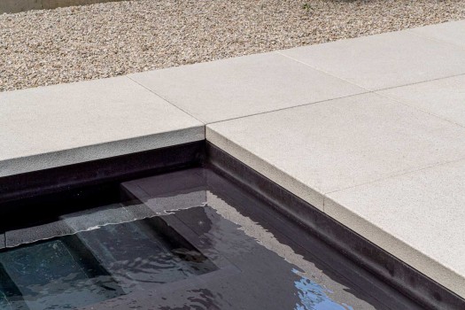 Und da Schwimmbadeinfassungen häufig nass werden, sind die Oberflächen kugelgestrahlt und damit rutschhemmend.