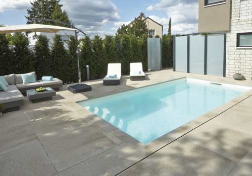 Arcadia Betonplatten sind angenehm barfuß begehbar und besonders für Terrassen und Pooleinfassungen geeignet.