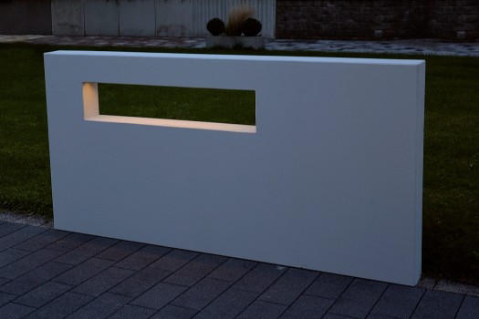 Alessio kann auch als Stele verarbeitet werden. Hierzu wird ca. 1/3 der Steinhöhe einbetoniert. Eine gute Entwässerung des Hinterfüllmaterials und das Anlegen einer Mauerschutzbahn (z.B. Noppenfolie) an der Rückseite sind notwendig.