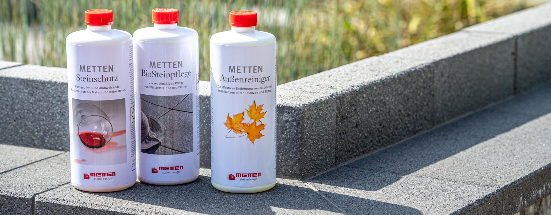 Zur laufenden Pflege von Natur- und Betonsteinen empfehlen wir METTEN BioSteinpflege. Dieses spezielle Produkt schützt den Stein bei regelmäßiger Anwendung. Es ist frei von Phosphaten, Laugen, Wachsen und Polymeren und biologisch abbaubar.