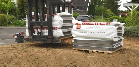Beginnen wir zunächst mit den zwei unterschiedlichen Arten, mit denen Sie Ihre gewünschte Fläche belegen können: entweder Pflastersteine aus Naturstein oder Pflastersteine aus Betonstein. Die Profis von METTEN Stein+Design haben da allerdings eine ganz klare Haltung: Die Verlegung von Natursteinpflaster sollten Privatkunden lieber Fachleuten aus dem Garten- und Landschaftsbau überlassen. Der Grund dafür ist einfach und kurz erklärt: Jeder einzelne Natursteinpflaster-Stein, auch Katzenkopf genannt, ist unterschiedlich in Größe und Schlagung und jeder einzelne Stein wird in die gewünschte Fläche gelegt – wie bei einem Mosaik. Am Ende wird bei der Natursteinpflasterverlegung nicht die gesamte Fläche abgerüttelt, sondern jeder einzelne Stein wird mit dem Gummihammer festgeklopft. Damit die Fläche nachher wirklich steht und nicht durch Belastungen wie die durch einen PKW verschoben wird, ist bei der Verlegung von Natursteinpflaster fachkundiges Know-how von beispielsweise von METTEN-FachPartnern zwingend erforderlich.