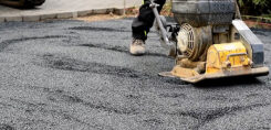 Mit der Rüttelplatte wird die Schotterfläche lagenweise verdichtet. Nun folgt das Splitt-oder Sandbett in einer Höhe von etwa drei bis fünf Zentimetern.